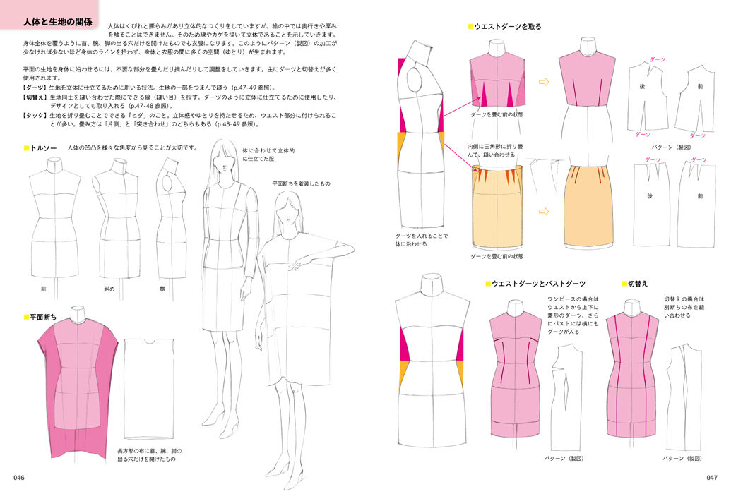 人が服を着ると、どこに、どのようなシワができるのか、デザインとして入れるシワ(ギャザーやドレープなど)とはどう違うのか、立体的な構造の洋服に必須のダーツやタックについても触れています。