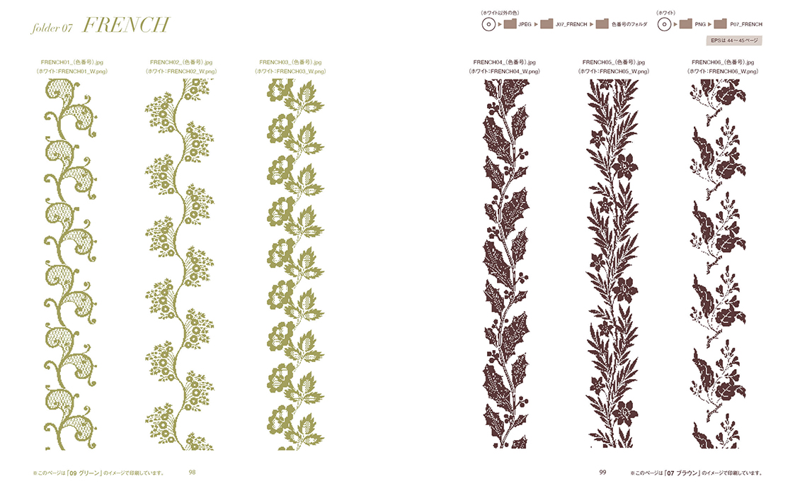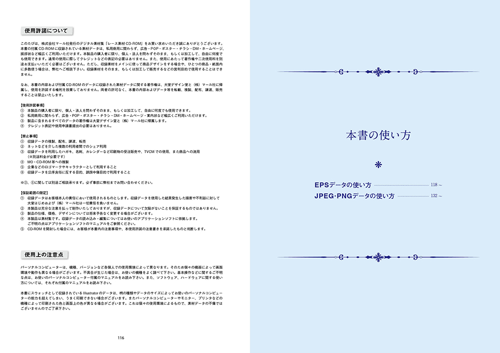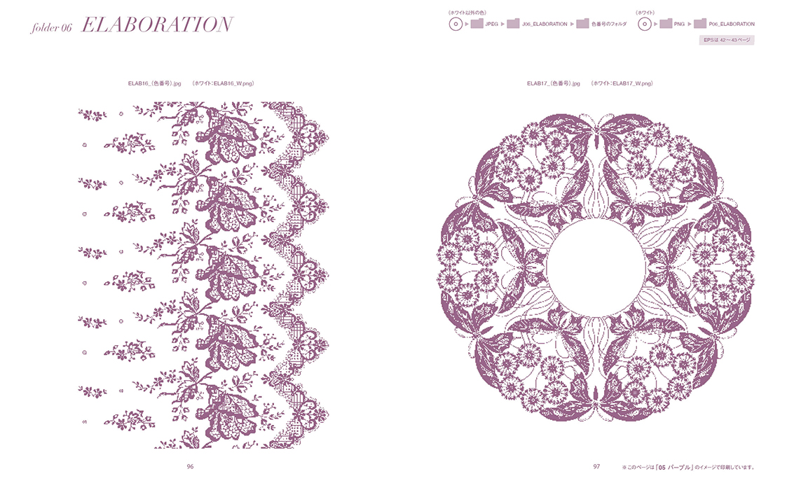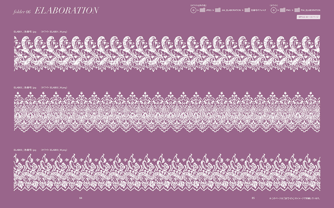 シンプル、繊細、豪華…選りすぐりの美しいレース素材をEPSアウトラインデータと、ホームページやブログ、ワードなどで簡単に使えるJPEG・PNGデータの三形式で収録。グラフィックデザイナー待望のIllustrator EPS 形式のパスデータと一般の方も広く使えるJPEG・PNG形式のデータが収録されています。EPS形式ではパーツを取り出して拡大し部分的に使う事もできますし、組み合わせれば無限に増殖する罫や地紋にもなります。こんなに便利でいいの?と、どうぞ実感して下さい。