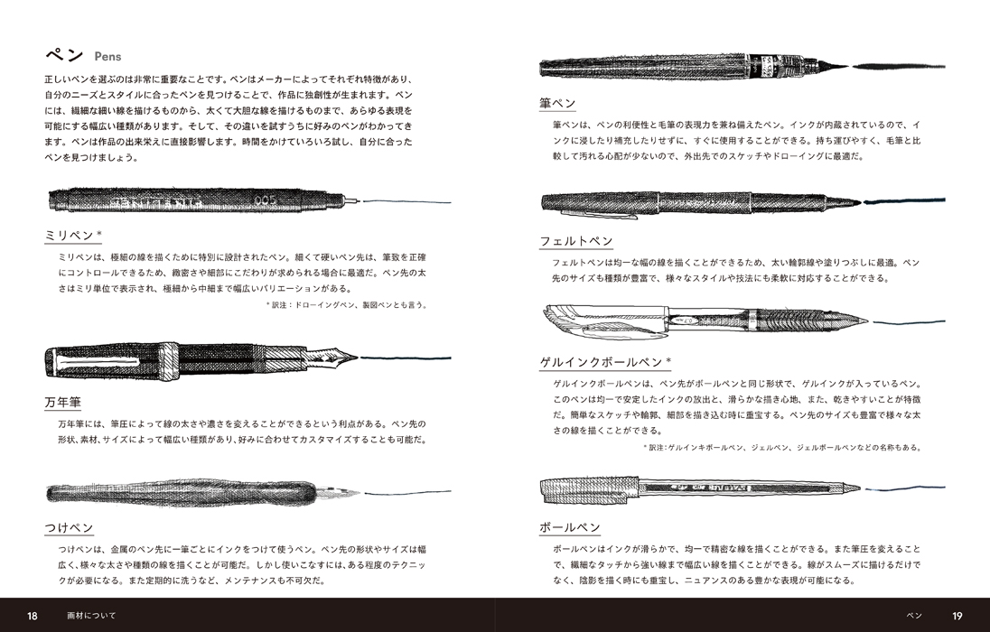 ペン画の魅力と、それを生み出すテクニックが詰まった本書は、まさに「初めて読むペン画の本」としてぴったりの1冊。