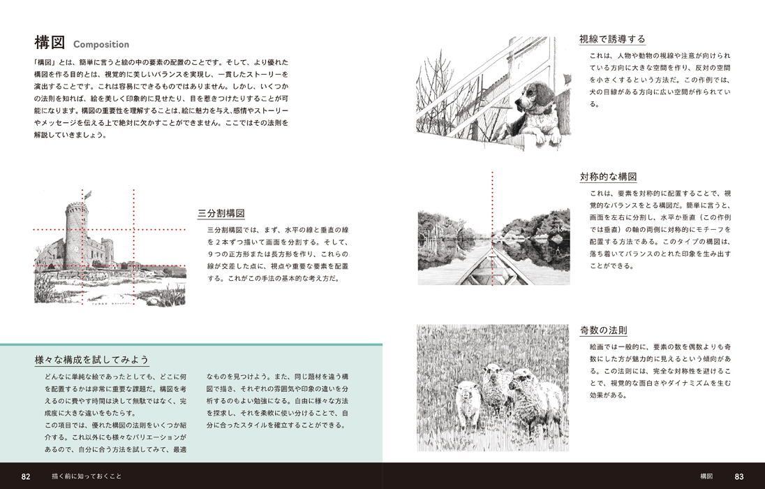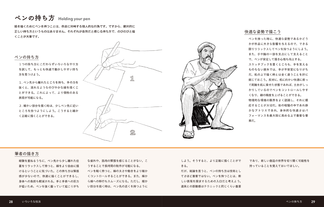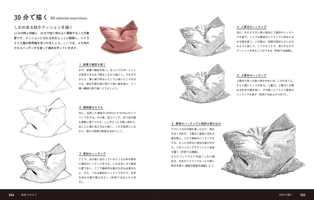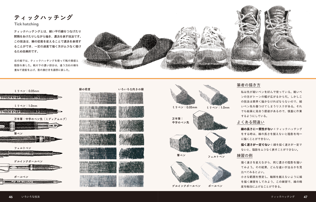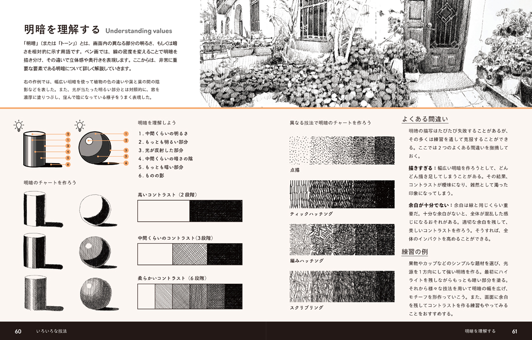 アーティストであり美術講師、そして建築家でもある著者が、道具やペンの持ち方から、クロスハッチングをはじめとする技法、題材選びや、アタリのとり方、構図について紹介します。